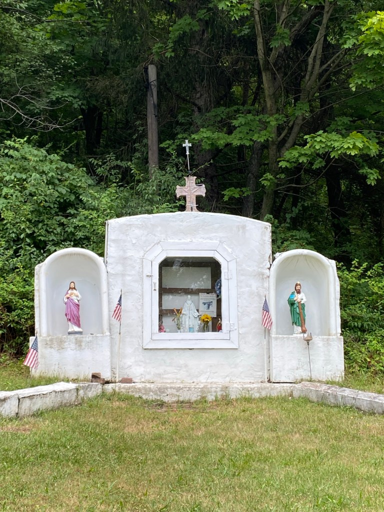 A Byrnesville family maintains a website chock full of history and imagery that dates back to the town’s heyday. They also maintain a religious shrine along the highway. I stopped for a closer look. They list the website on a small sign there: http://byrnesville.com.